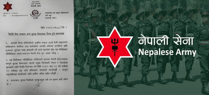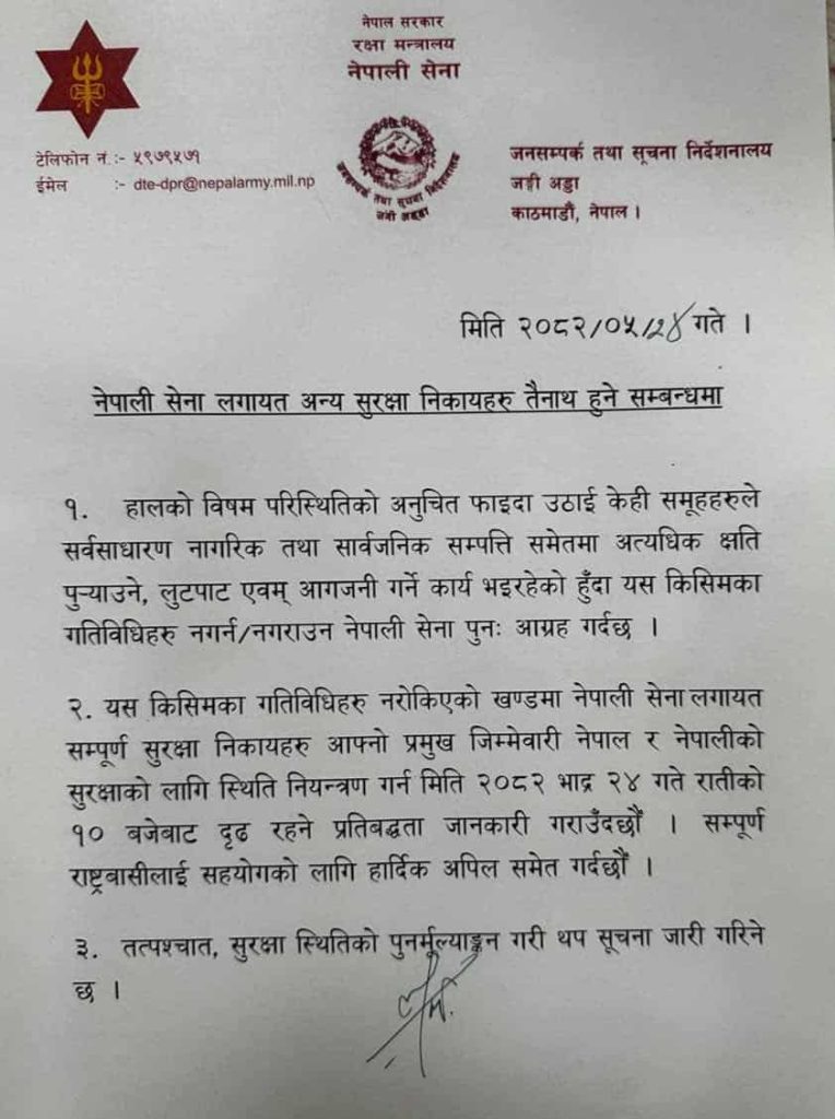 नेपाली सेनाले जारी गरेको विज्ञप्तिमा भनिएको छ कि यस्ता गतिविधि रोकिएन भने, नेपाली सेना र अन्य सुरक्षा निकायहरू आफ्नो प्रमुख जिम्मेवारी अनुसार स्थिति नियन्त्रण गर्न आजै रात १० बजेबाट दृढ कदम चाल्नेछन्। विज्ञप्तिमा देशबासीलाई सहयोग र समझदारीका साथ स्थिति नियन्त्रणमा साथ दिन अपील गरिएको छ।