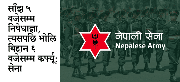 काठमाडौँ,२५भदौ ।नेपाली सेनाले बुधबार बेलुकीसम्मका लागि निषेधाज्ञा जारी गरेको छ। सेनाको जनसम्पर्क तथा सूचना निर्देशनालयले सार्वजनिक अपिल जारी गर्दै बुधबार बेलुकी ५ बजेसम्म निषेधाज्ञा लागू हुने जनाएको हो।