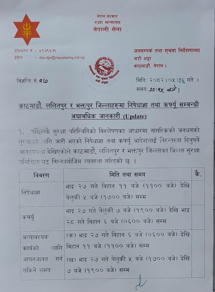 सेनाले भदौ २७ गते बिहान ११ बजेदेखि साँझ ५ बजेम्म निषेधाज्ञा तथा बेलुकी ७ बजेदेखि २८ गते बिहान ६ बजेसम्म भने कर्फ्यु आदेश जारी रहने जनाएको छ।
