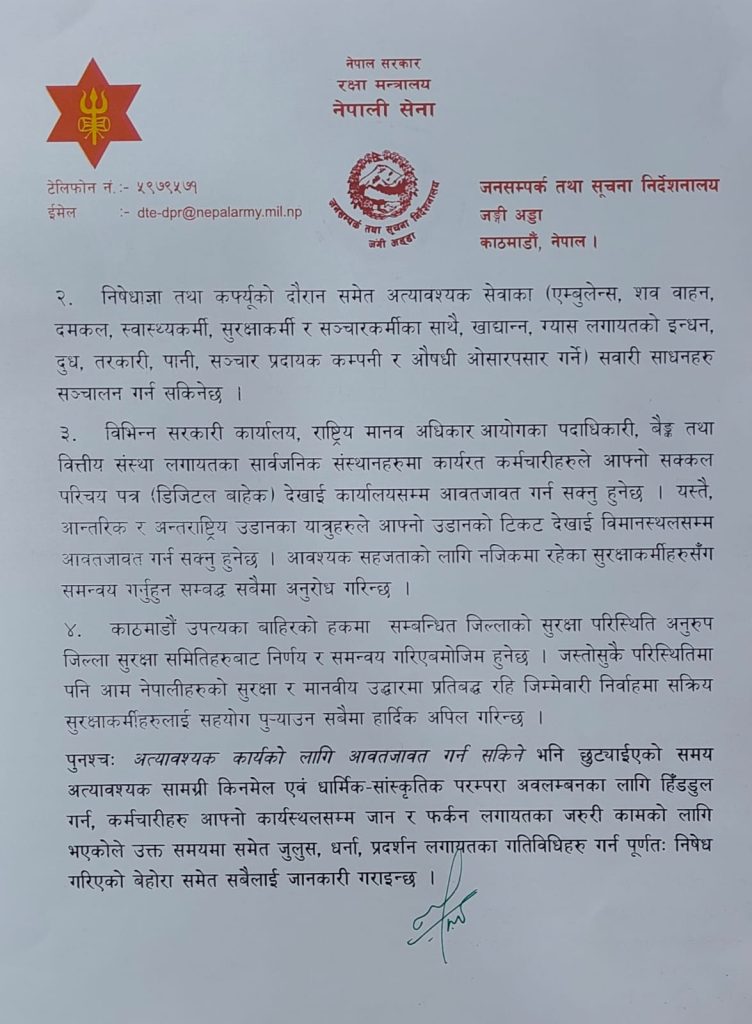 ‘पछिल्लो सुरक्षा परिस्थितिको विश्लेषणका आधारमा नागरिकको जनधनको सुरक्षाको लागि जारी भएको निषेधाज्ञा तथा कर्फ्यु आदेशलाई निरन्तरता दिनुपर्ने आवश्यकता देखिएकोले काठमाडौँ, ललितपुर र भक्तपुर जिल्लाका सुरक्षा समितिहरुबाट निम्नबमोजिम व्यवस्था गरिएको छ,’ सेनाले सूचना जारी गर्दै भनेको छ।