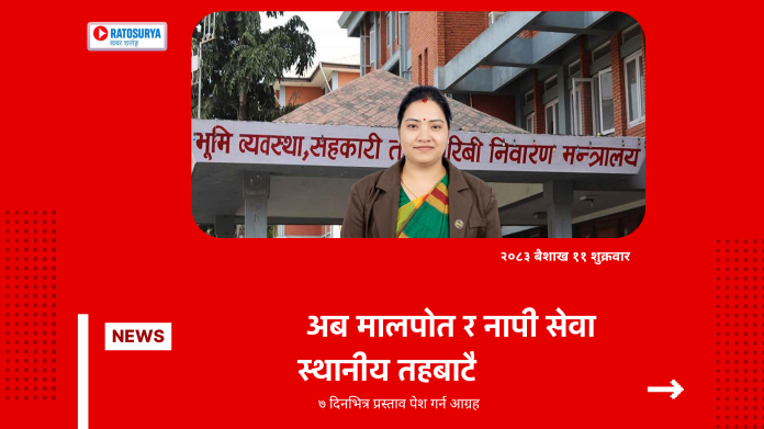 काठमाडौं, ११ वैशाख ।भूमि व्यवस्था, सहकारी तथा गरिबी निवारण मन्त्रालयले भूमि प्रशासनसम्बन्धी सेवा स्थानीय तहबाटै प्रवाह गर्ने प्रक्रिया अघि बढाएको छ।